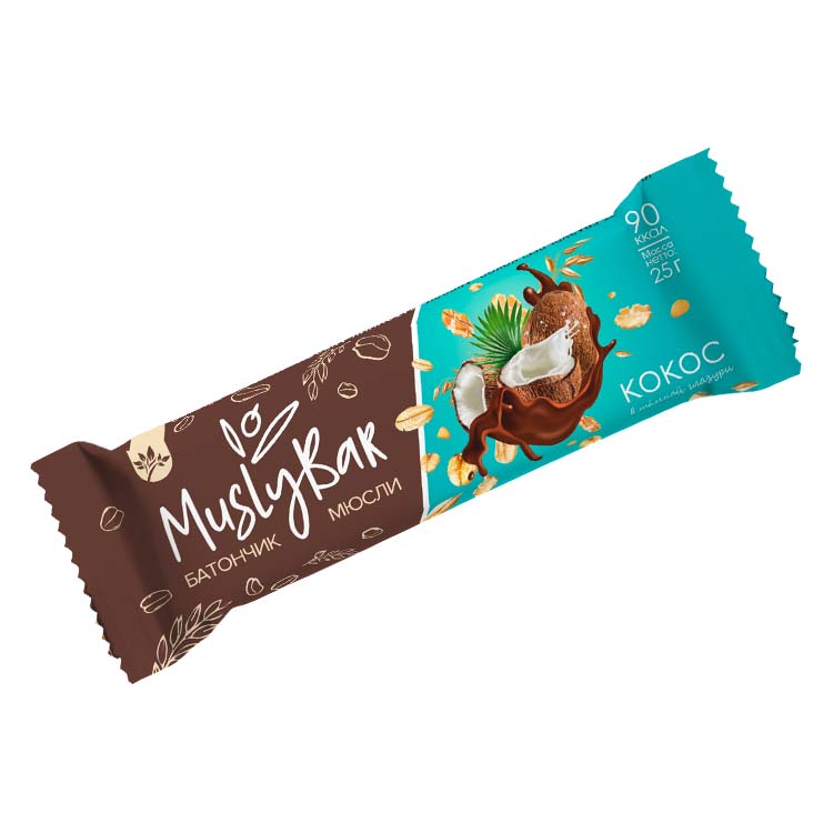 Наша продукция / Пищевая продукция и БАД / Батончики мюсли / Батончики мюсли "MuslyBar" / Батончики мюсли КОКОС в темной глазури «MuslyBar»