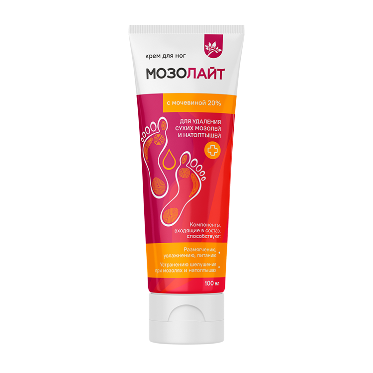 Крем для ног «Мозолайт» с мочевиной, ланолином и серебром для удаления сухих мозолей и натоптышей разработан специально для ухода за кожей стоп и помощи при сухих мозолях и натоптышах. Содержит мощный кератолитик* - карбамид (мочевина) в высокой концентрации – 20%. Такой процент содержания мочевины является эффективным и безопасным в условиях домашнего использования (средства с содержанием карбамида свыше 20% могут использоваться только в условиях салона под наблюдением специалиста).