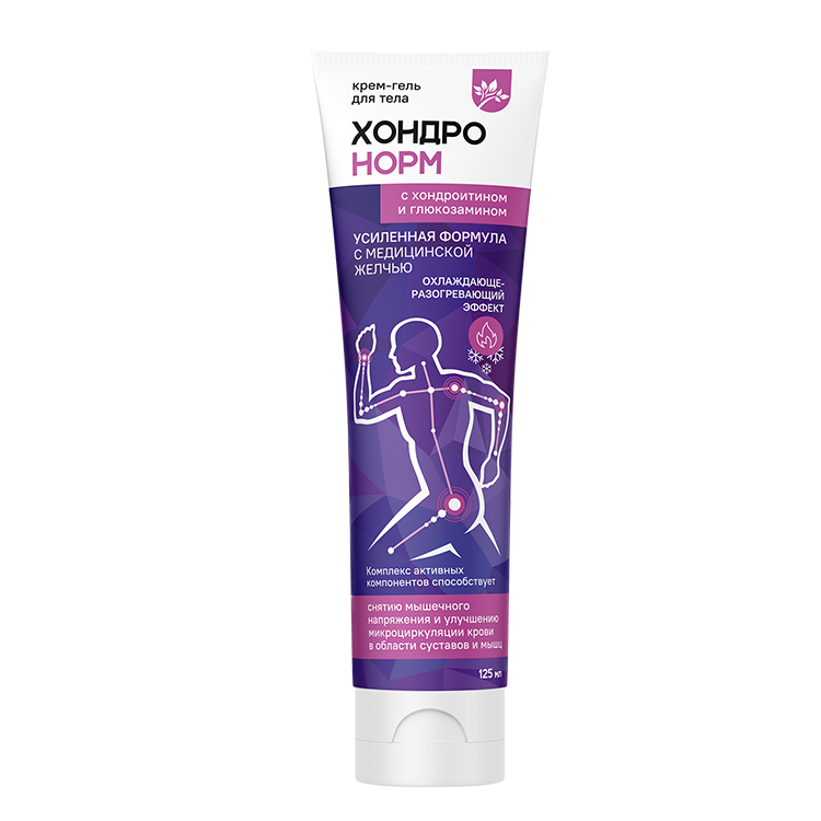 Серия крем-гелей «ХОНДРОНОРМ» разработана специально для оказания активной направленной помощи при суставных и мышечных болях. Комплекс активных компонентов способствует снятию мышечного напряжения и улучшению микроциркуляции крови в области суставов и мышц; проявляет разогревающий / разогревающе -охлаждающий эффекты крови в поверхностном слое кожи, вызывая отвлекающий эффект и уменьшая воспаление. ГЛЮКОЗАМИН — естественный компонент суставных тканей — помогает восстановлению хряща, нормализует выработку внутрисуставной жидкости, улучшая подвижность суставов, питает и восстанавливает клетки хрящей — хондроциты. ХОНДРОИТИН участвует в построении основного вещества хрящевой ткани, ускоряет восстановление и тормозит процессы дегенерации, повышает амортизационные свойства суставов. Растительные экстракты и ухаживающие вещества способствуют снятию мышечного напряжения, улучшению микроциркуляции крови, снятию застойных явлений и отеков; проявляют ухаживающий эффект за кожей; оказывают противовоспалительное, антисептическое, легкое обезболивающее свойства; обладают согревающим и расслабляющим эффектом. Высокоэффективная формула крем-геля усилена медицинской желчью. Желчь проявляет выраженный раздражающий эффект, за счет чего способствует более активной микроциркуляции крови в области суставов и мышц и ослаблению болезненных ощущений, а также более эффективному проникновению хондропротекторов в глубокие слои кожи.