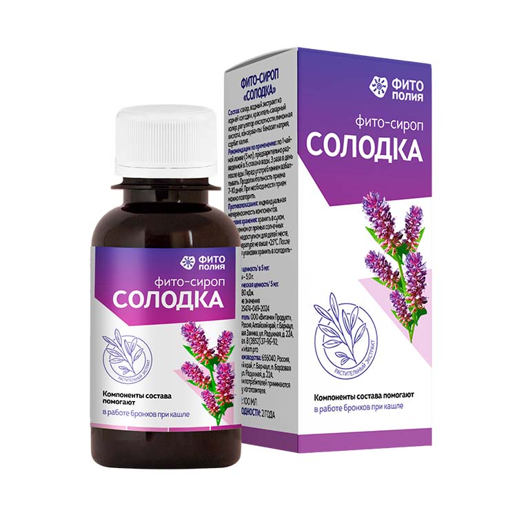 Фито-сироп «Солодка» содержит флавоноиды, аскорбиновую кислоту (витамин С), эстриол, камеди, смолы, эфирные масла, а также редкое вещество глицирризин, которое обеспечивает противовоспалительное и спазмолитическое действие, способствует продуцированию иммунных клеток - интерферонов.